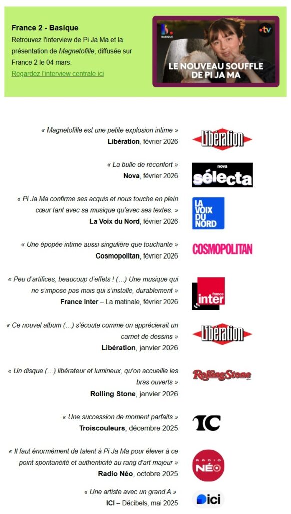 2026 marquera donc son attendu retour à la scène. Entourée d’une équipe artistique et technique 100% féminine, Pi Ja Ma reprendra la route dès janvier 2026 !